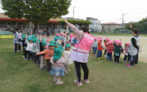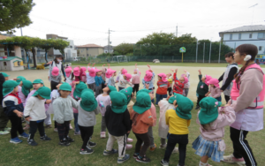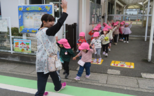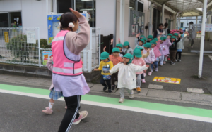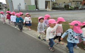 年少組が手を繋いで、おさんぽに出掛けました。