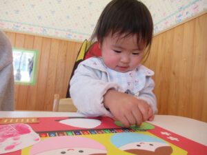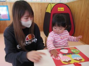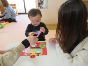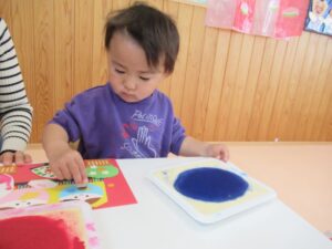 2月はおひなさま製作を行いました。ひなあられを黄色、ピンク、緑のスタンプでポンポンと押したり、飾りのシールをペタッと貼ったり、みんなの可愛い手型が桜の花になりました(*^^*)