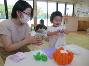 「おにぎり~おにぎり~♪」と歌いながら丸めた緑と紫で、かわいい持ち手もつけました。