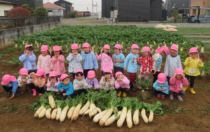 畑に到着すると、園長先生から「ぐらぐら揺らしてから引っ張るんだよ」と掘り方の説明を聞きました。